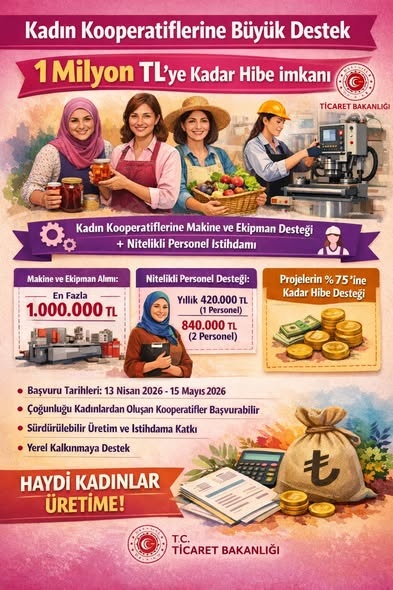 Ticaret Bakanlığınca ortaklarının en az %90’ını kadınların oluşturduğu kooperatiflerde proje tutarlarının %75’i karşılanabilecektir. Proje tutarlarının kalan kısmı ise proje yürütücüsü kooperatif tarafından karşılanacaktır.Kooperatiflerin Desteklenmesi Programı kapsamında ortaklarının çoğunluğu kadınlardan oluşan ve kadın emeğini değerlendirme amacı güden kooperatif ve üst kuruluşlarının, faaliyet konularına uygun, üretim ve istihdama katkı sağlayacak ve sürdürülebilir nitelikteki makine ve/veya ekipman ile ilgili mal alımları ile söz konusu projelerine ilişkin nitelikli personel istihdamlarına destek sağlanacaktır.